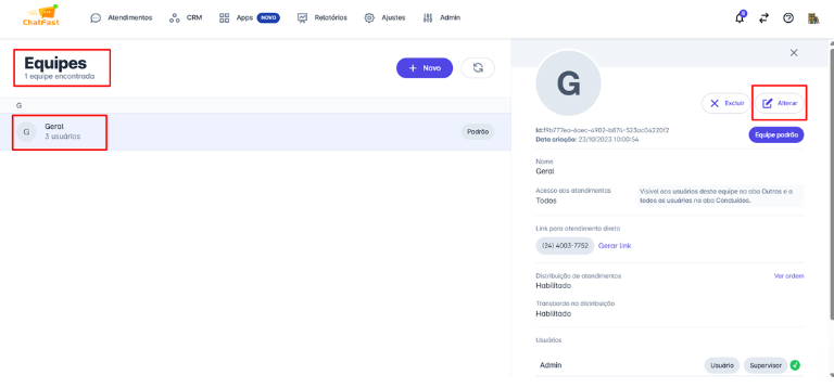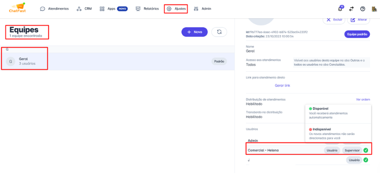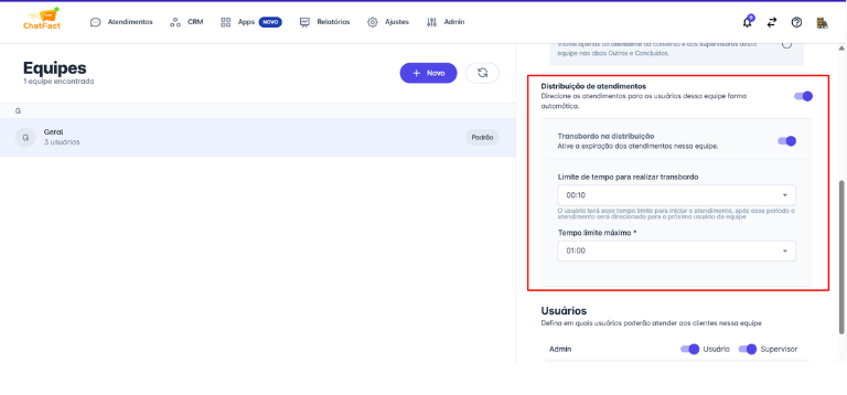 Na janela de ajustes da equipe, ative ou desative a funcionalidade de distribuição de atendimentos. Uma vez ativada o sistema passará a associar um usuário para cada novo atendimento.