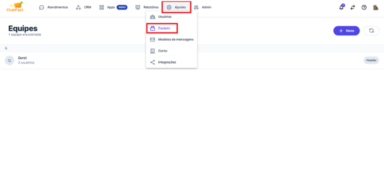Passo 1: Para acessar essa configuração na plataforma, no menu principal clique em Ajustes em seguida Equipes.
