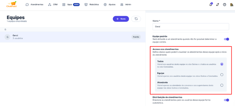 📌 Se você precisa que toda a equipe tenha acesso às conversas → Escolha a opção "Todos".\ 📌 Se deseja restringir o acesso apenas à equipe responsável → Use a configuração "Equipe".\ 📌 Se quer um atendimento mais restrito, acessível apenas pelo atendente e supervisores → Opte por "Atendente".