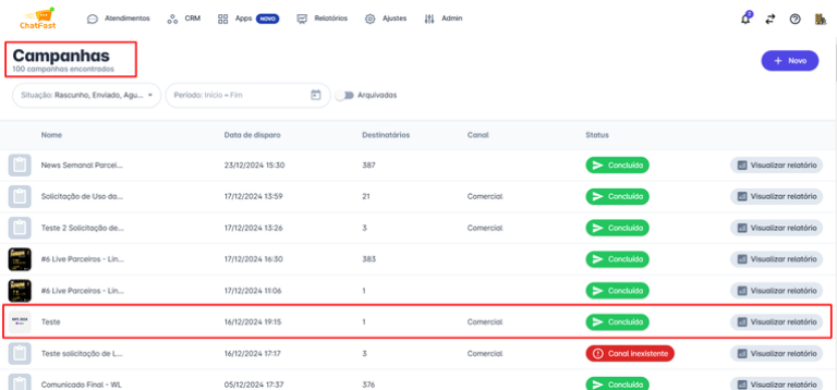 Passo 2: Uma tela com todas as campanhas realizadas será aberta. Selecione a campanha que deseja arquivar e clique sobre ela.