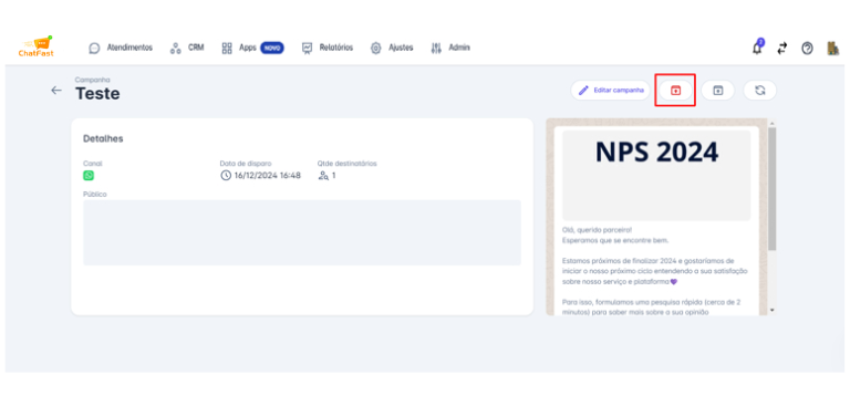 Passo 3: A tela com os dados da campanha selecionada será aberta. Para arquivar, basta clicar no ícone de arquivo,