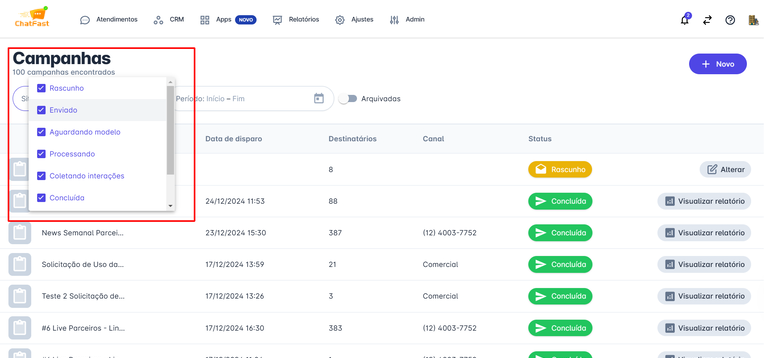 Passo 2: Localize a campanha que deseja consultar. Para isso, você pode utilizar os filtros disponíveis, como o filtro por período ou situação da campanha.
