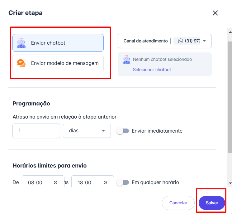 - Ação da Etapa: Escolha a ação que será realizada nesta etapa (envio de mensagem, ação no chatbot, etc.).