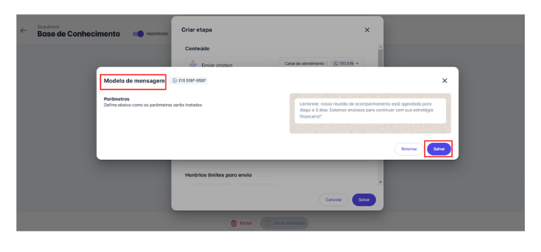 Passo 5: Uma janela será aberta para configurar uma etapa da sequência. O primeiro passo é selecionar o canal que será utilizado. Em seguida, decida se deseja enviar um chatbot ou um modelo de mensagem e selecione a opção desejada. Neste exemplo, será utilizado um modelo de mensagem.