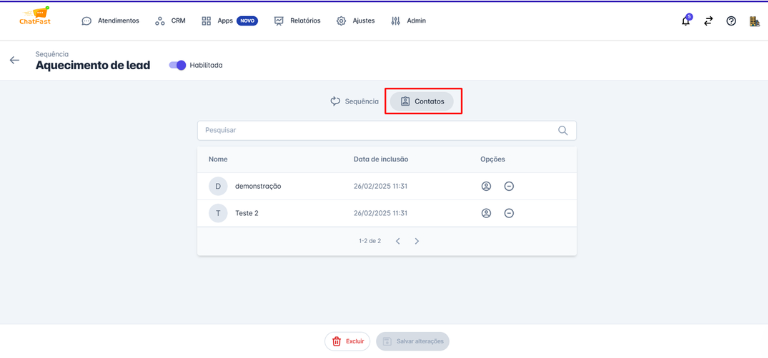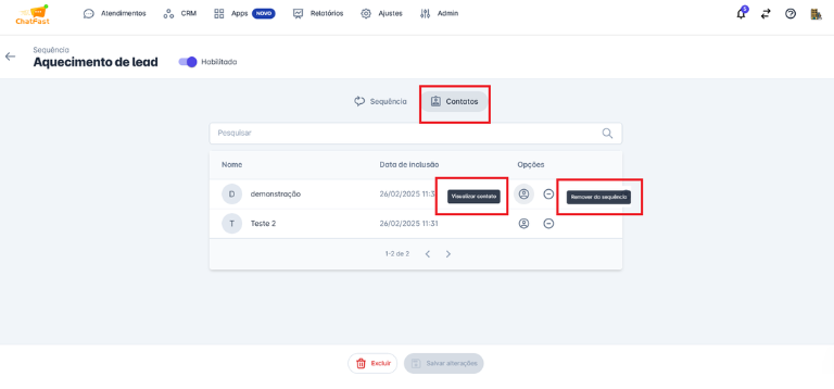 - A inclusão e exclusão de contatos em uma sequência também pode ser feita diretamente nos detalhes do contato.