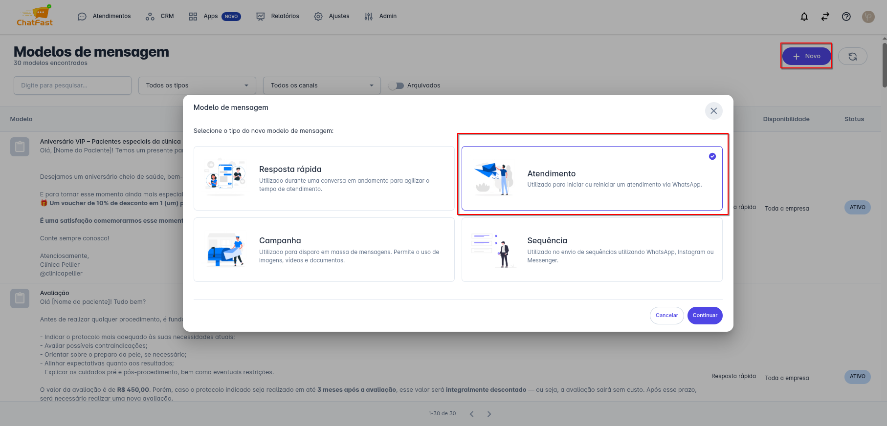 - Somente os usuários com perfil de Administrador podem cadastrar modelos de mensagens do tipo Atendimento, Campanha e Sequência.