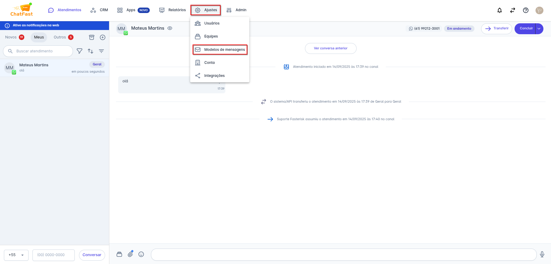 Passo 1: Na tela inicial da plataforma, clique na opção “Ajustes”, o menu de opções se abrirá, clique em Modelos de Mensagens.