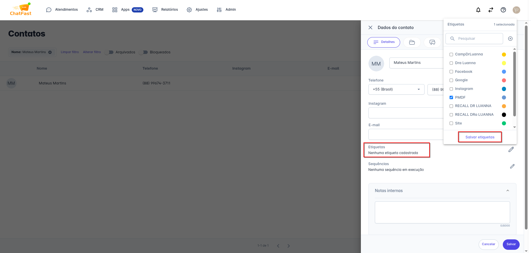 Passo 2: Na lateral direita, abrirá uma janela contendo os dados relacionados ao contato. A plataforma possui campos pré-existentes, como Nome, Telefone, E-mail, Instagram, Etiquetas, Carteirização, Sequências e Notas Internas. No entanto, também é possível inserir campos personalizados. Quando um campo personalizado é adicionado, ele será replicado automaticamente para todos os demais contatos.