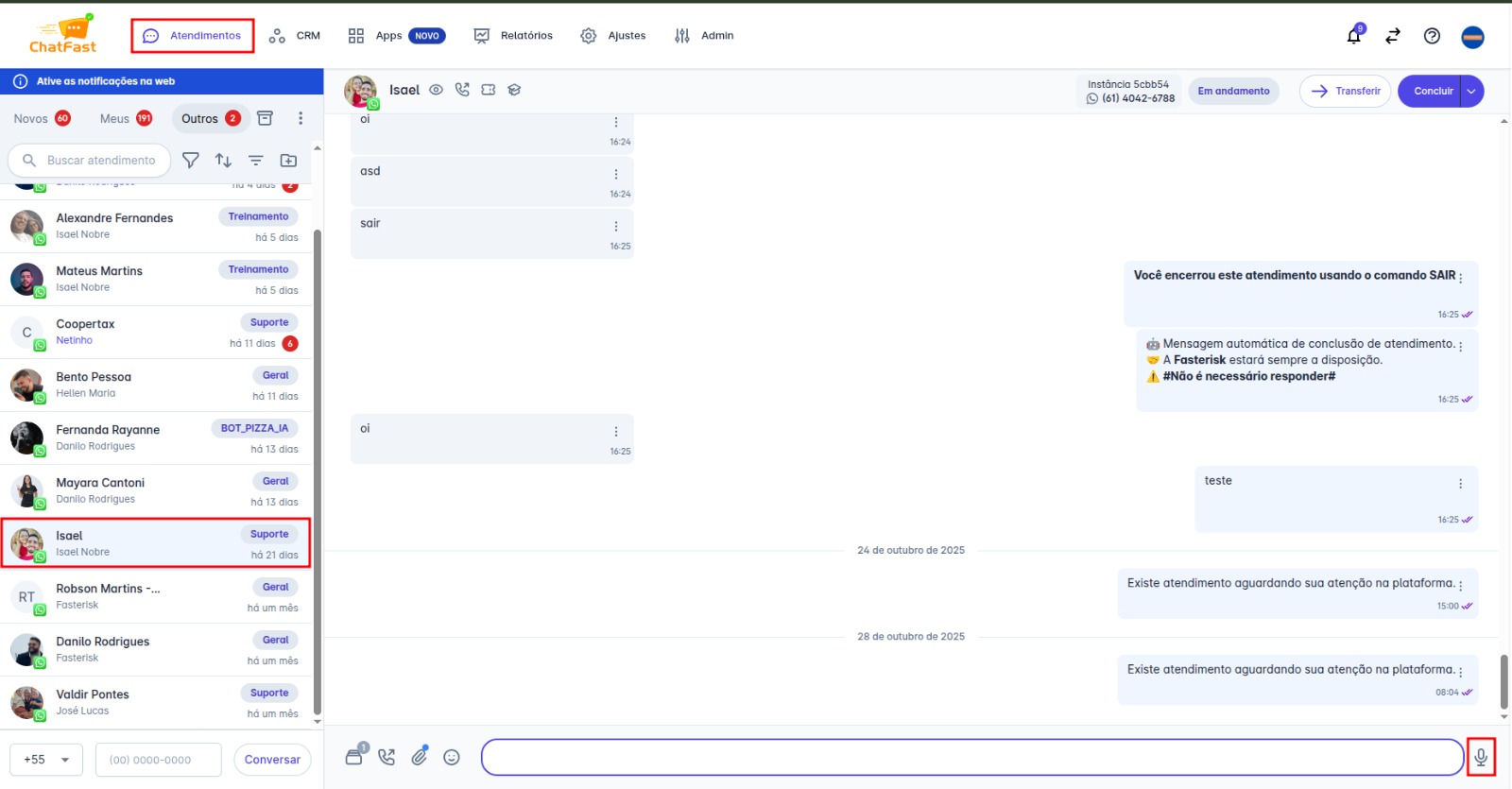 Passo 1: Na tela inicial, acesse o menu 'Atendimentos'. Selecione o contato para o qual deseja enviar um áudio, para que a janela de conversa seja aberta.