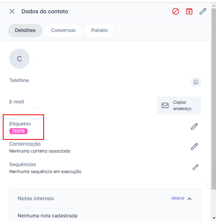 Passo 2 da 2ª opção: Uma aba com os dados do contato será exibida na lateral direita da tela. No menu "Detalhes", clique no ícone