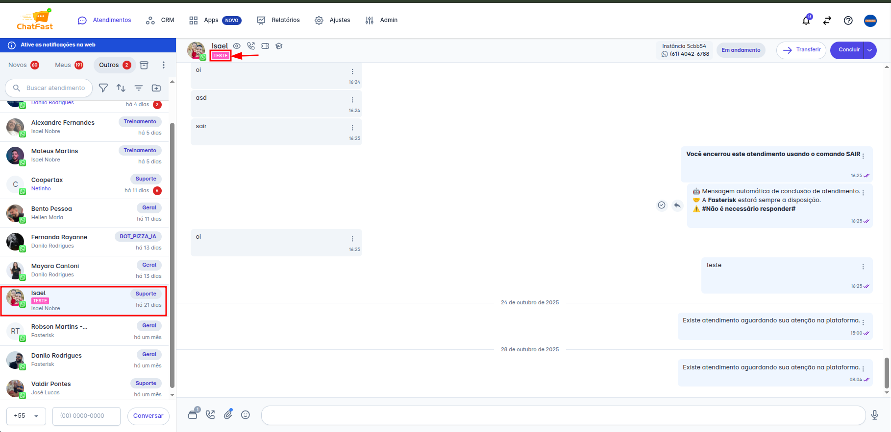 Passo 1 da 2ª opção: Na tela inicial da plataforma, clique na opção 💬 "Atendimentos". Em seguida, clique no contato para o qual deseja inserir a etiqueta.