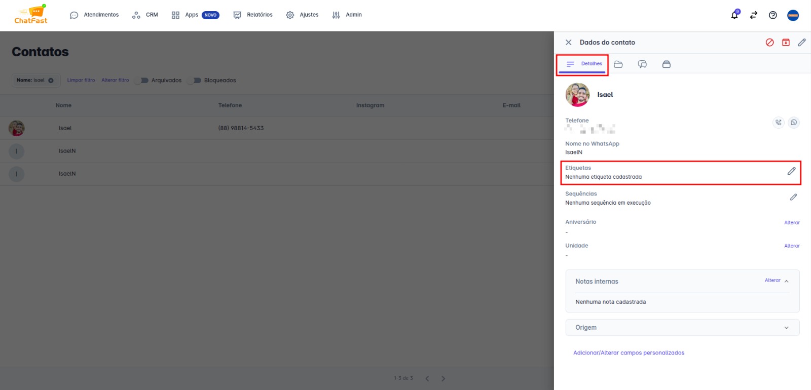 Passo 3 da 1ª opção: Após criar ou selecionar a etiqueta e salvá-la no contato, ela já aparecerá vinculada automaticamente.
