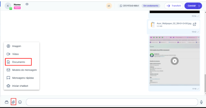 Passo 1: Na tela inicial, acesse o menu "Atendimentos". Selecione o contato para o qual deseja enviar um documento, para abrir a janela de conversa. Em seguida, clique no ícone