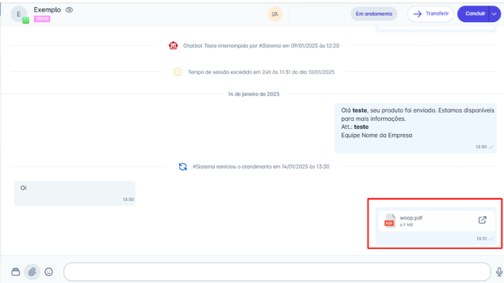 - A plataforma segue as regras do WhatsApp para o tamanho de envio de arquivos. No caso de documentos, o tamanho máximo é de 100 MB. Caso o arquivo ultrapasse esse limite, a plataforma enviará um link para que o contato possa fazer o download.
