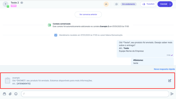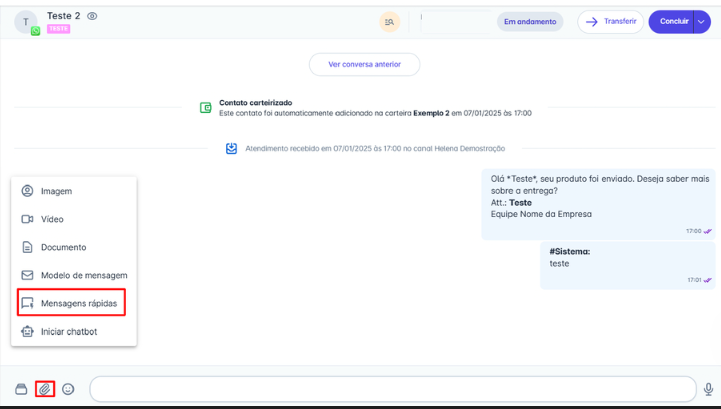 Passo 1: Na tela inicial, acesse o menu "Atendimentos". Selecione o contato para o qual deseja enviar um modelo de mensagem, para abrir a janela de conversa. Em seguida, clique no ícone