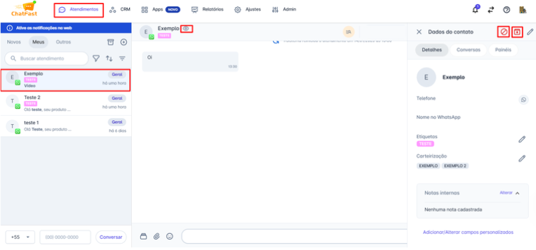 2ª - Na tela inicial, acesse o menu "Atendimentos". Selecione o contato que deseja bloquear ou arquivar e clique sobre ele para que a janela de conversa seja aberta. Em seguida, clique no ícone, e