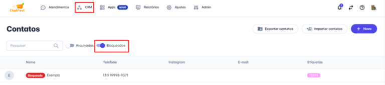 Passo 3: Para visualizar os contatos arquivados e bloqueados, na tela inicial, clique no menu CRM e, em seguida, na opção Contatos. Selecione a chave de arquivados ou bloqueados, e serão listados todos os contatos com esse status.