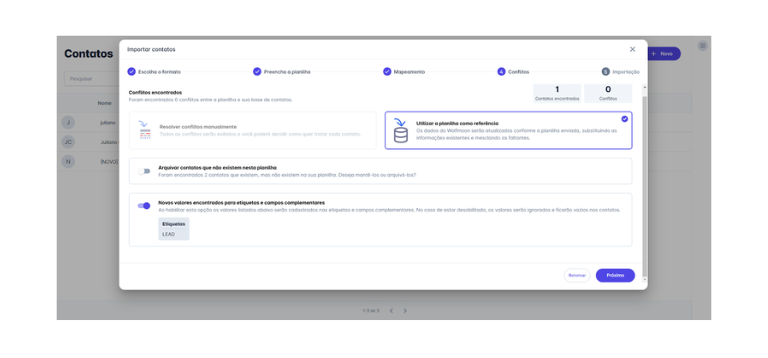Será possível escolher qual contato com o mesmo número deve ser mantido, permitindo que você substitua os dados existentes, combine informações ou ignore o novo dado importado. Essa etapa garante que os dados na plataforma sejam consistentes, evitando duplicidades e preservando a integridade das informações.