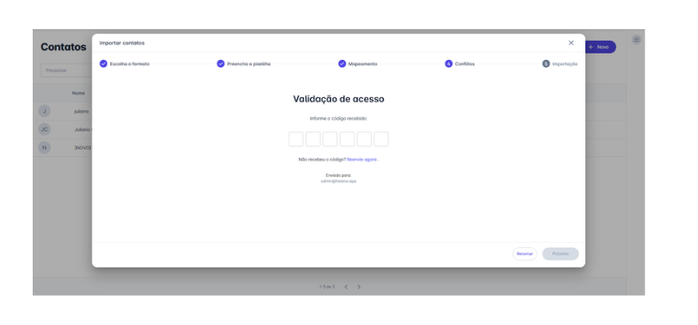Passo 5: Para prosseguir com a ação de importação, será necessário informar o código de validação. Esse código será enviado automaticamente para o e-mail e/ou número do WhatsApp associado ao usuário logado. Após receber o código, insira-o na plataforma para concluir a validação e continuar com o processo de importação. Essa etapa adiciona uma camada extra de segurança e controle às ações realizadas na plataforma.
