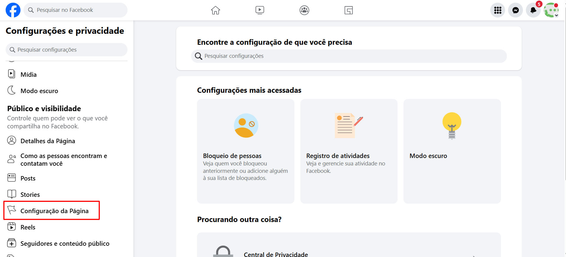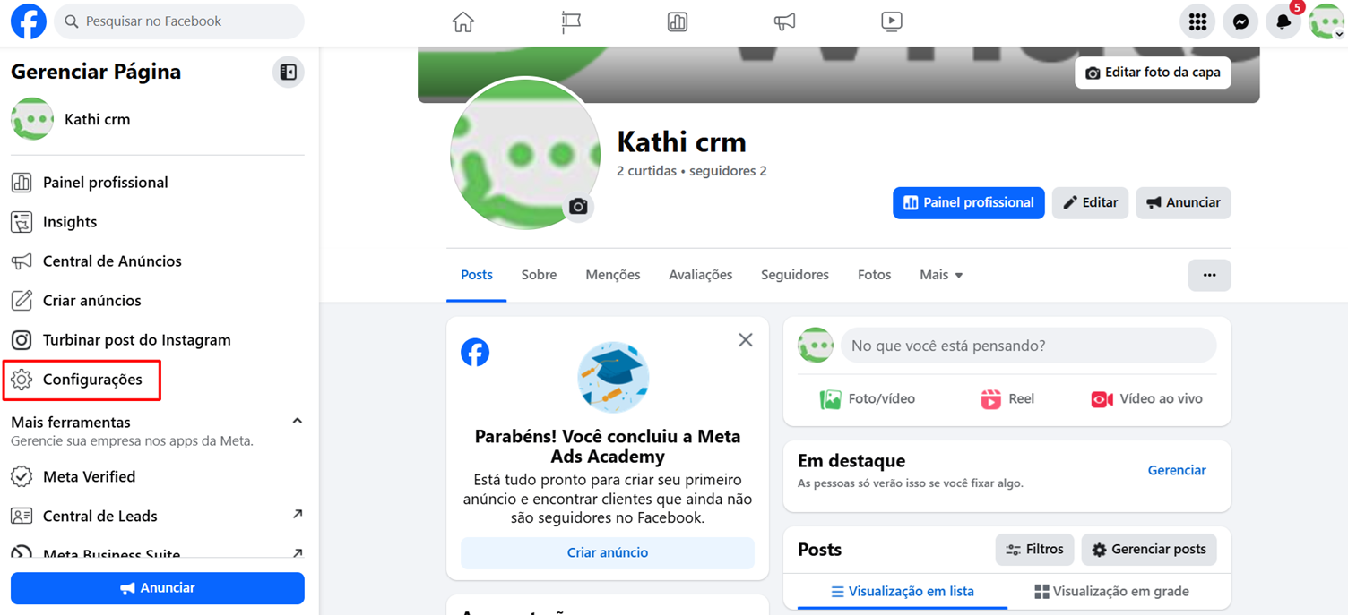 1º Passo: Acesse a conta do Facebook vinculada ao seu Instagram. Clique em Configurações no menu superior direito.