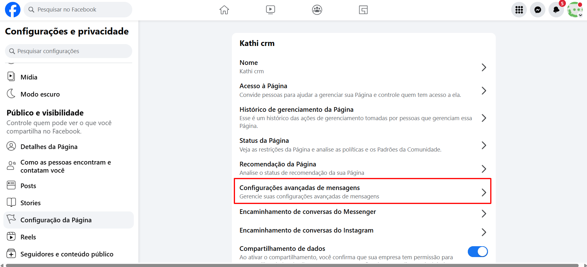 3º Passo: Clique em “Configurações avançadas de mensagens” para acessar as configurações de mensagens da página.