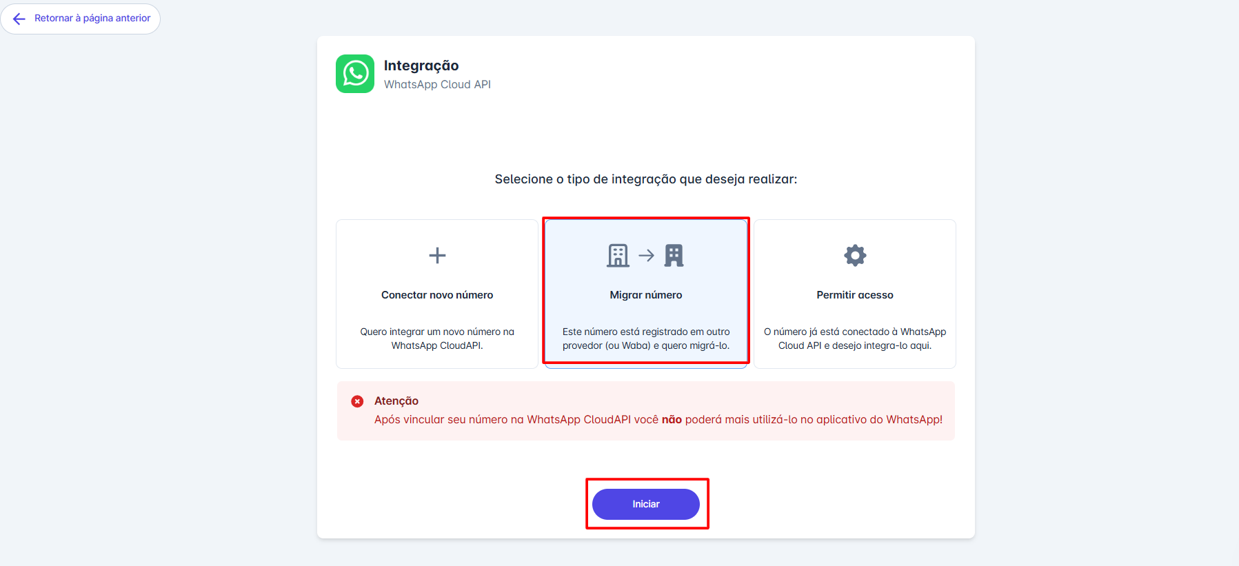 Passo 4: Na tela seguinte selecione a opção de migrar número e em seguida clique em iniciar.