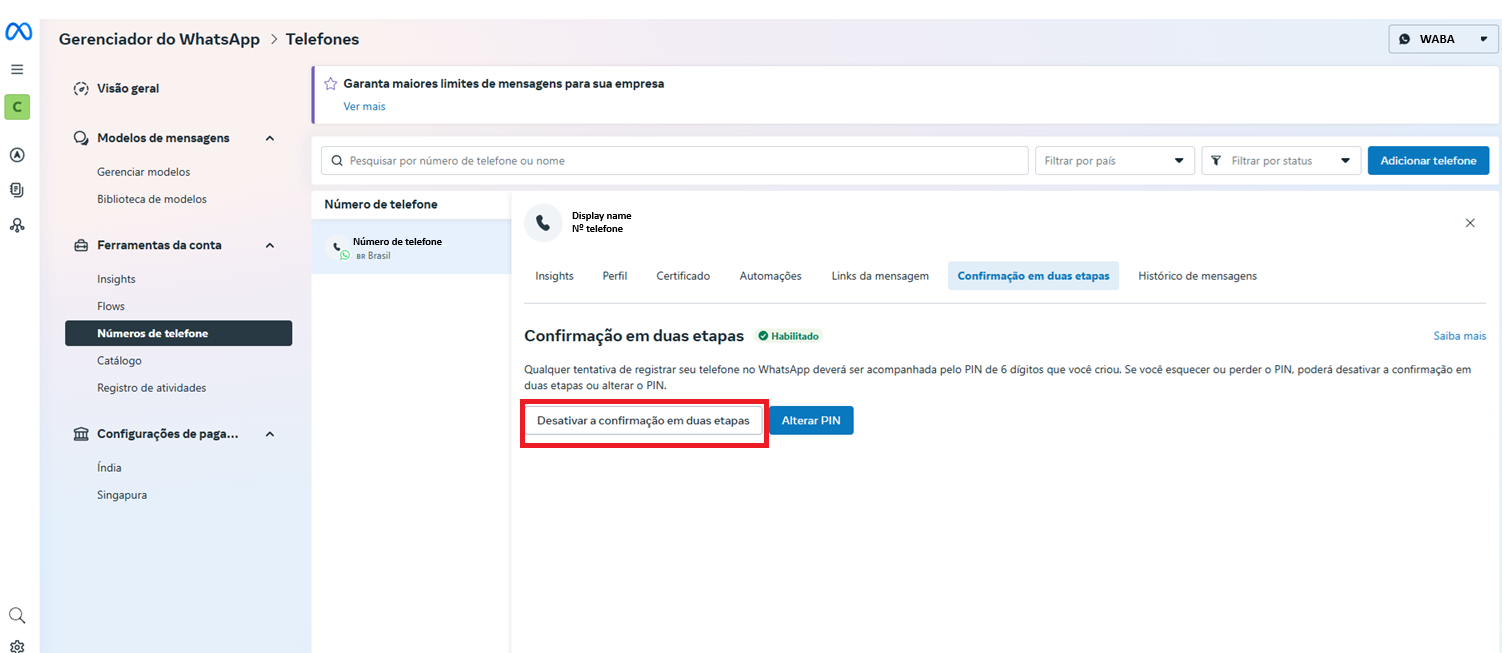 - A autenticação em dois fatores da WABA está desativada.