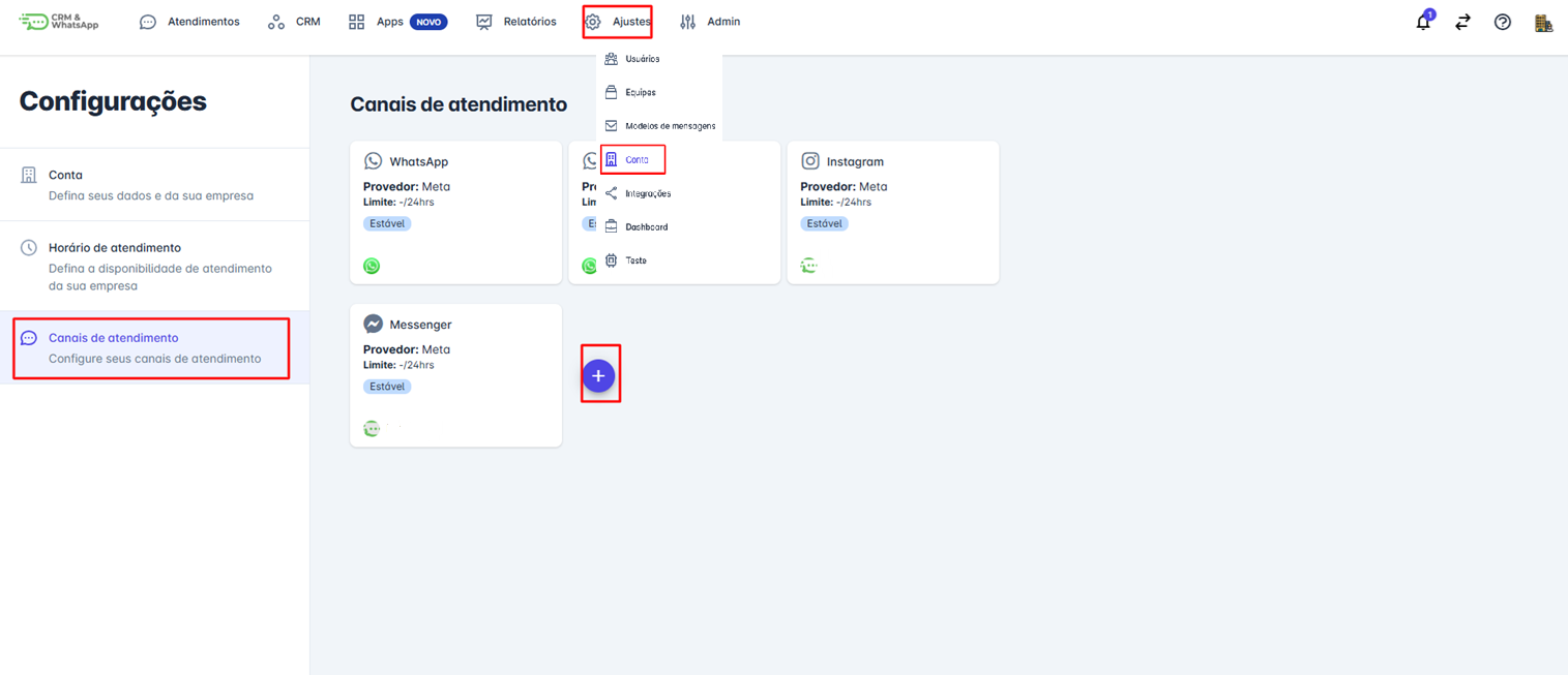 Acesse a plataforma, clique em "Ajustes", depois em "Conta" e, na aba "Canais de Atendimento", selecione o botão "+" para iniciar uma nova conexão com o WhatsApp via Cloud API.