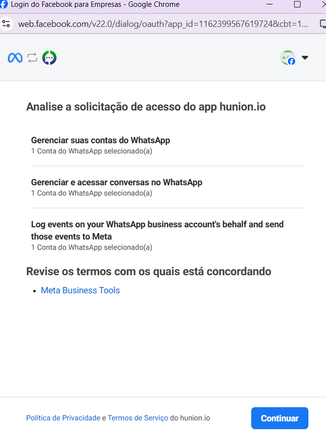 Passo 12: Após aceitar os termos de acesso que a Hunion.io terá, clique em "Continuar" para prosseguir.