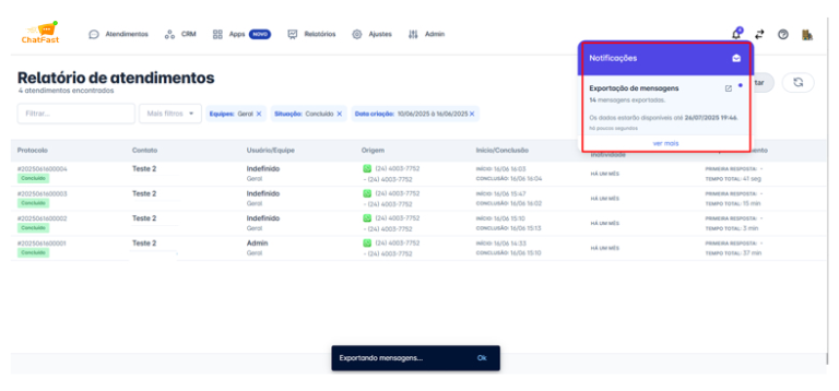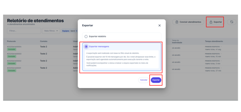 Exportar mensagens: Gera um arquivo contendo o conteúdo completo das conversas realizadas nos atendimentos filtrados.